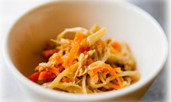 - 柿は皮をむいて4等分に切り、1/4個分だけ1cm角に切る。